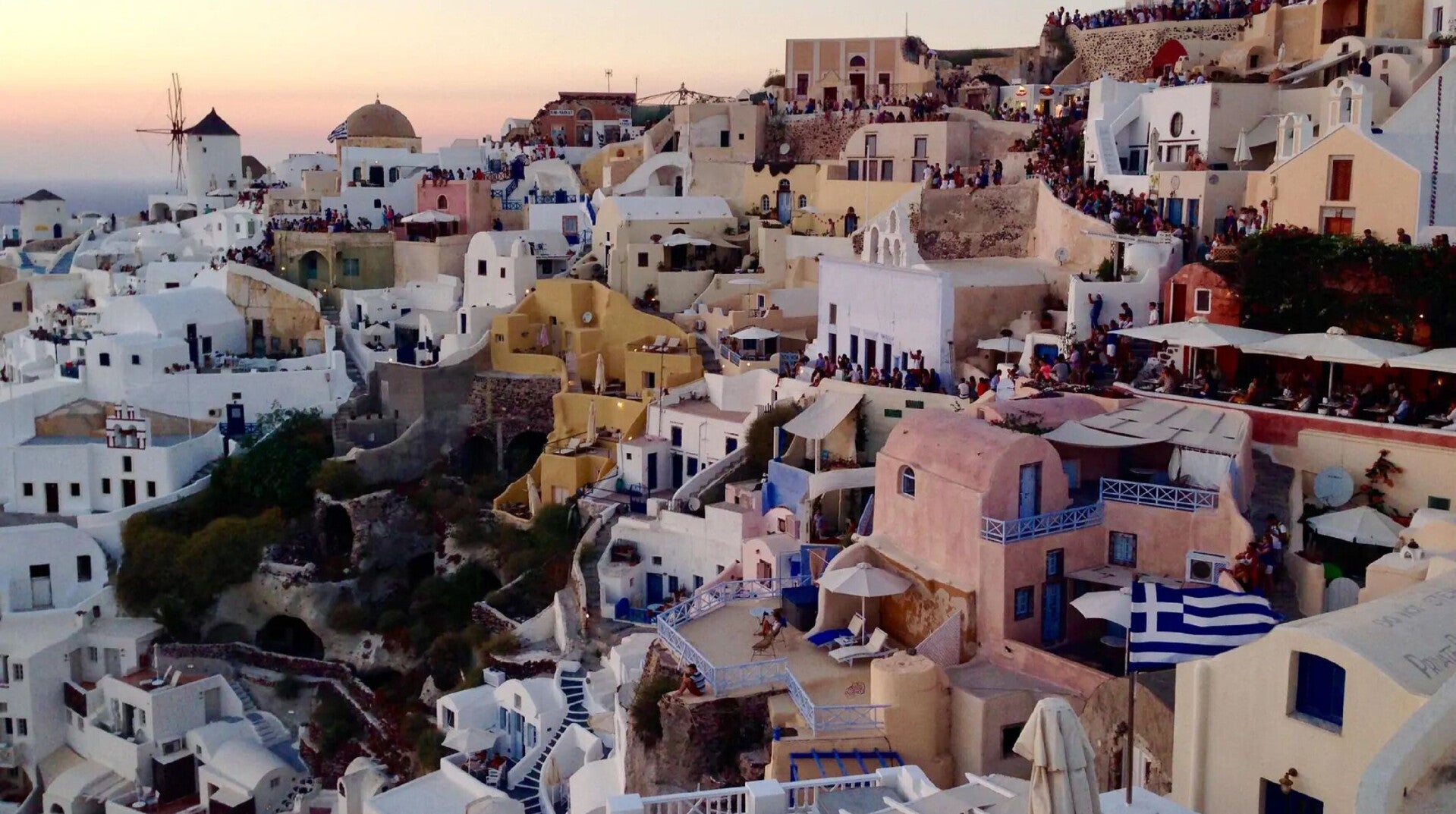 Santorin: bekannt für seine weißen Häuser mit blauen Kuppeln. Viele Cafés und Restaurants sind inzwischen barrierefreundlich.