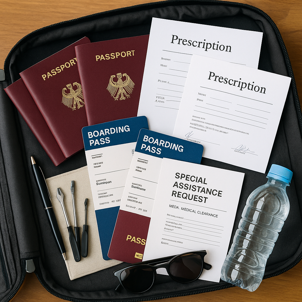 Medikamente mitnehmen + Reserve (30 % mehr). Arztbrief in Englisch, Kopien digital und auf Papier. Ersatzteile für Rollstuhl, Liner, Ladegeräte. Alles doppelt checken. Pro-Tipp: eine eigene „Gesundheitsbox“ packen, griffbereit im Handgepäck.