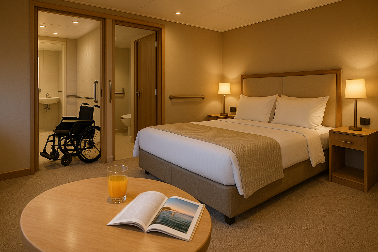 Hotels werben oft mit „barrierefreien Zimmern“ – und dann passt der Rollstuhl nicht einmal durch die Badezimmertür. Auf unseren Yachten ist das anders: Jede Kabine ist so geplant, dass Platz zum Wenden bleibt. Die Türen sind breit, die Möbel stehen so, dass Bewegungsfreiheit entsteht.